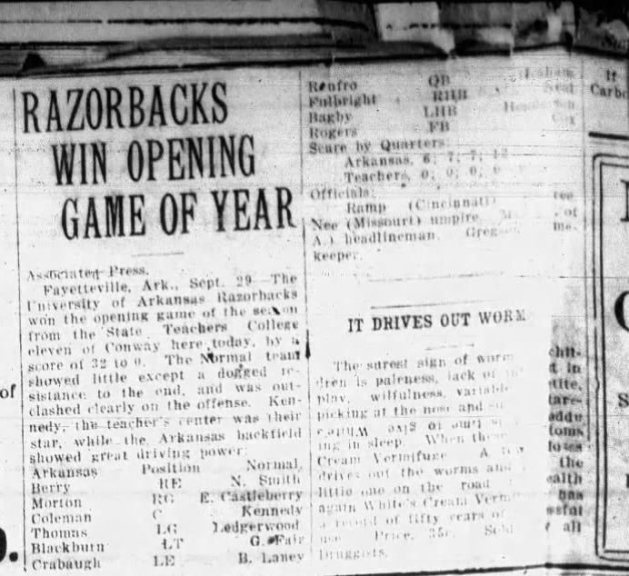 Para que os hagáis una idea de cuando viene esto, John Barnhill fue entrenador de los Razorbacks de 1946 a 1949 y Director Deportivo de 1946 a 1971. Casi nada.