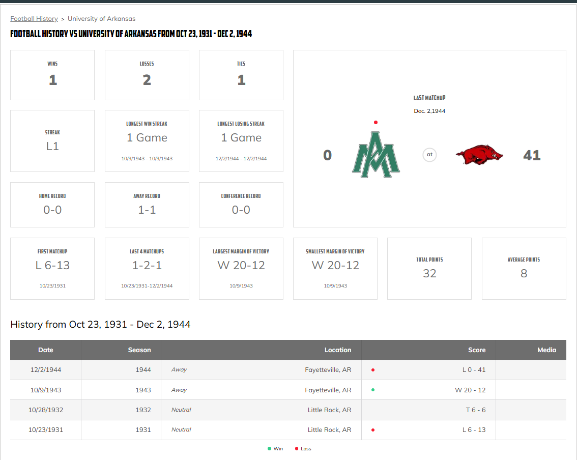 Arkansas-Monticello: 1-0-0. Pero como no soy feliz mirando solo una fuente he descubierto en la web de esta universidad que realmente han disputado 4 partidos con una victoria para los de Monticello que actualmente están englobados en DII en la Great American Conference.